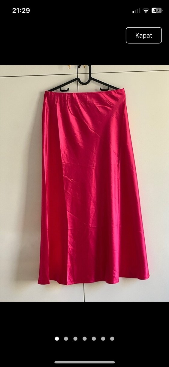 Pembe parlak ve satenimsi kumaştan, drapeli ve bol kesimli uzun kadın eteği. Minimalist ve normcore tarzıyla romantik buluşmalar için uygun.