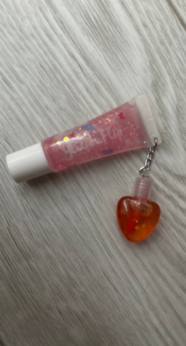 Parlak bitişli açık pembe dudak parlatıcısı, küçük kalp şeklinde bir aksesuarla süslenmiş.
