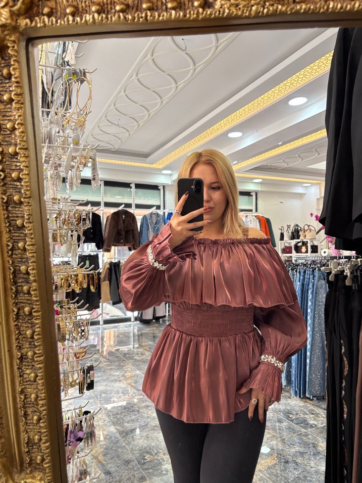Pembe Parlak Fırfırlı Kayık Yaka Bluz