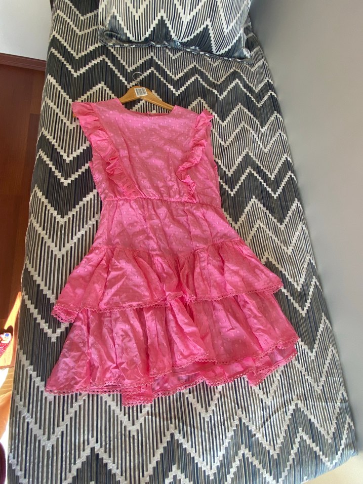 Pembe parlak sentetik kumaştan, fırfırlı detaylı, straplez ve uzun kesim, vücuda oturan elbisedir.m beden network saten ıpek karışım elbıse