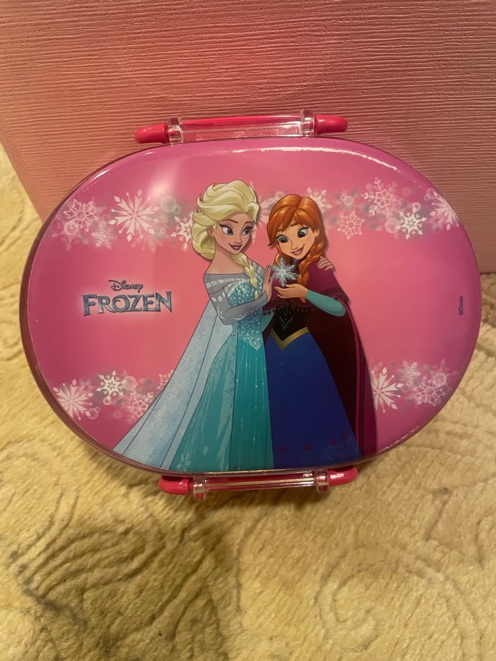 pembe renkte, Disney Frozen karakterli çocuk beslenme çantasıdır. Üst tarafta ufak bir çizilme mevcuttur. Fotoğraflarda görülmektedir.