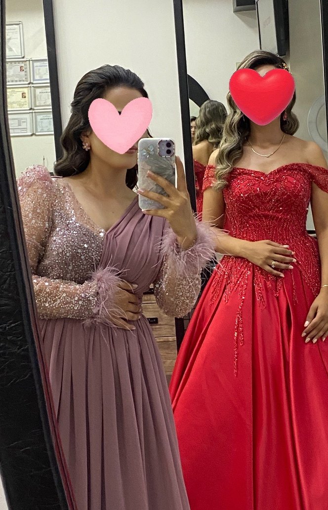 Pembe işlemeli ve parlak kumaştan, tüy detaylı uzun kollu, vücuda oturan modern klasik tarzda abiye elbise. ✨