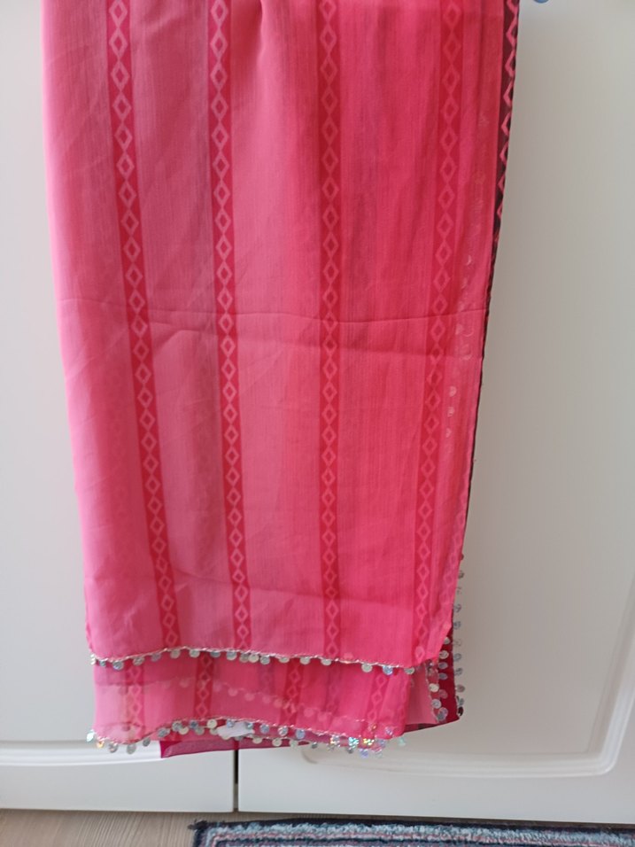 Pembe parlak, drapeli kadın pullu pareosu, bohem tarzıyla ve ince süslemeli kenar detayına sahip. şifon kumaştan üretilmiştir.