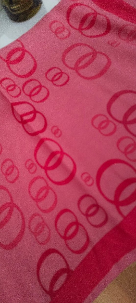Parlak sentetik kumaştan yapılmış, dairesel desenlere sahip pembe kadın fular. Çağdaş minimalist tarzda, drapeli ve şık bir tasarım sunar. imannoor marka harika bir şal