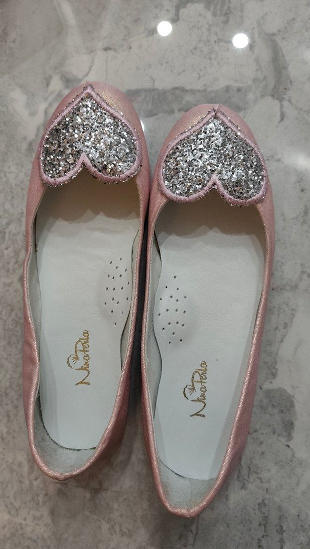 Pembe süet babet, burunda gümüş simli kalp detaylarıyla klasik şıklık ve pastel tonları bir araya getiriyor.