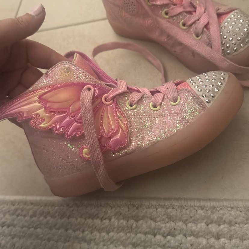 Pembe renkli, parlak pullu ve kanat işlemeli kız spor ayakkabısı. Kauçuk tabanlı, sokak modasına uygun tasarım.