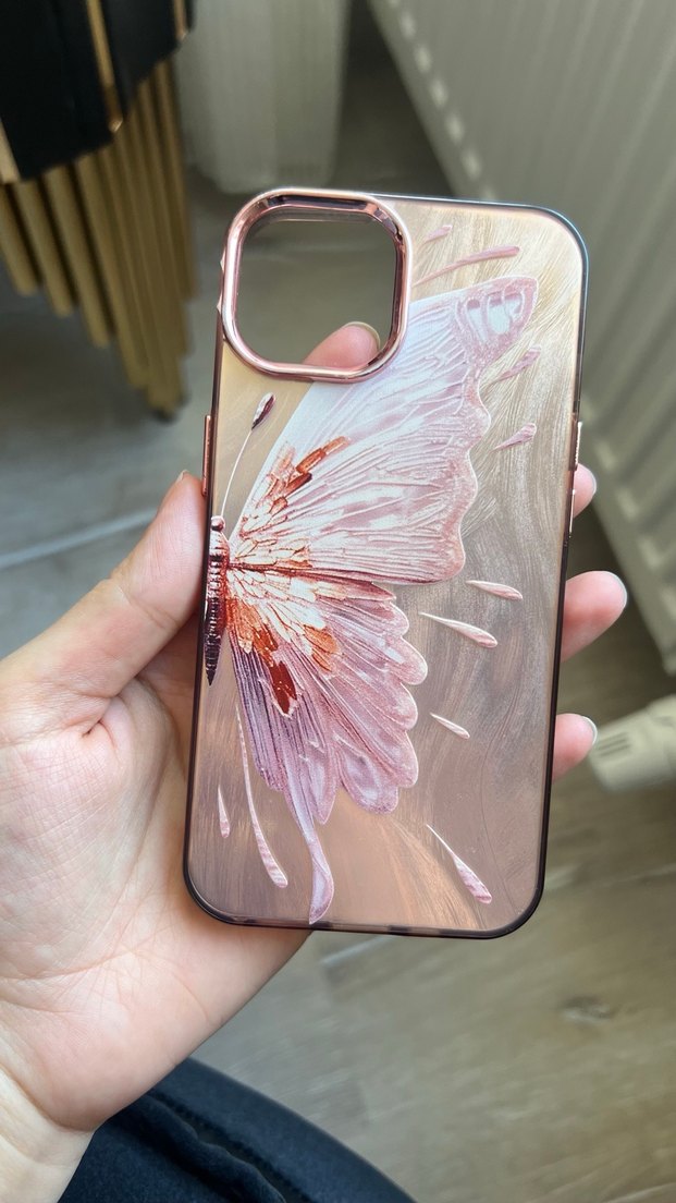 Parlak yüzeyli, pastel pembe kelebek desenli telefon kılıfı. Kamera kısmının orada ufak bi çıkıntı vardı cebe koyarken sürekli takıldığı için bilinçli olarak kırdım ama kullanıma engel değil. İPhone 13, 14, 15 uyumludur.