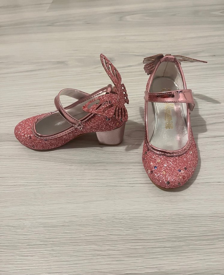 Pembe simli kelebek detaylı kız babetleri, yılan deseniyle süslenmiş ve kauçuk malzemeden yapılmıştır. Küçük topuklu ve bantlıdır.