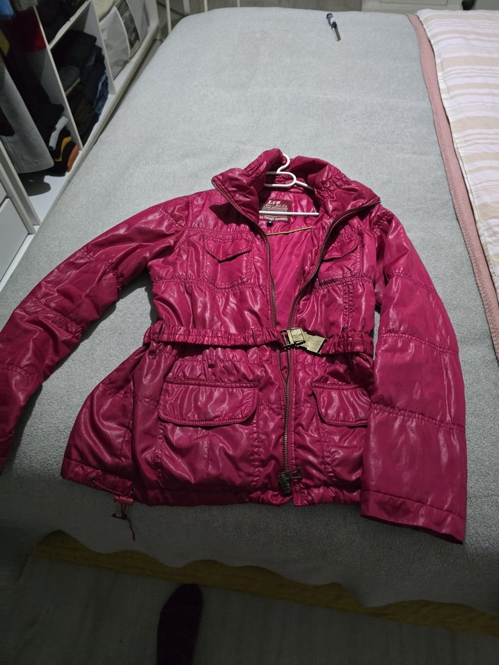 Pembe parlak ve kemerli, fitted kesim kadın ceket. Notched lapel yakalı, askılı kollu, midi boyda, sokak stili için uygun. Yumuşak ve sıcak kumaştan, çoklu ceplerle günlük kullanım için ideal.