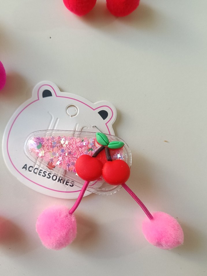 Parlak yüzeyli, renkli desenli ve kiraz figürlü pembe çocuk saç tokası, rock punk tarzına uygun.