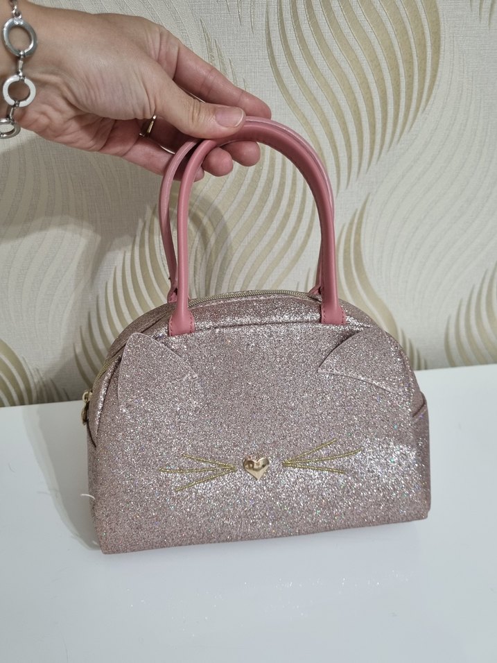 Pembe renkli, simli ve kedi yüzü desenli kız cocuk çantasıdır.Göz alıcı bir modeldir. kızım çok az kullandı ve tertemizdir.