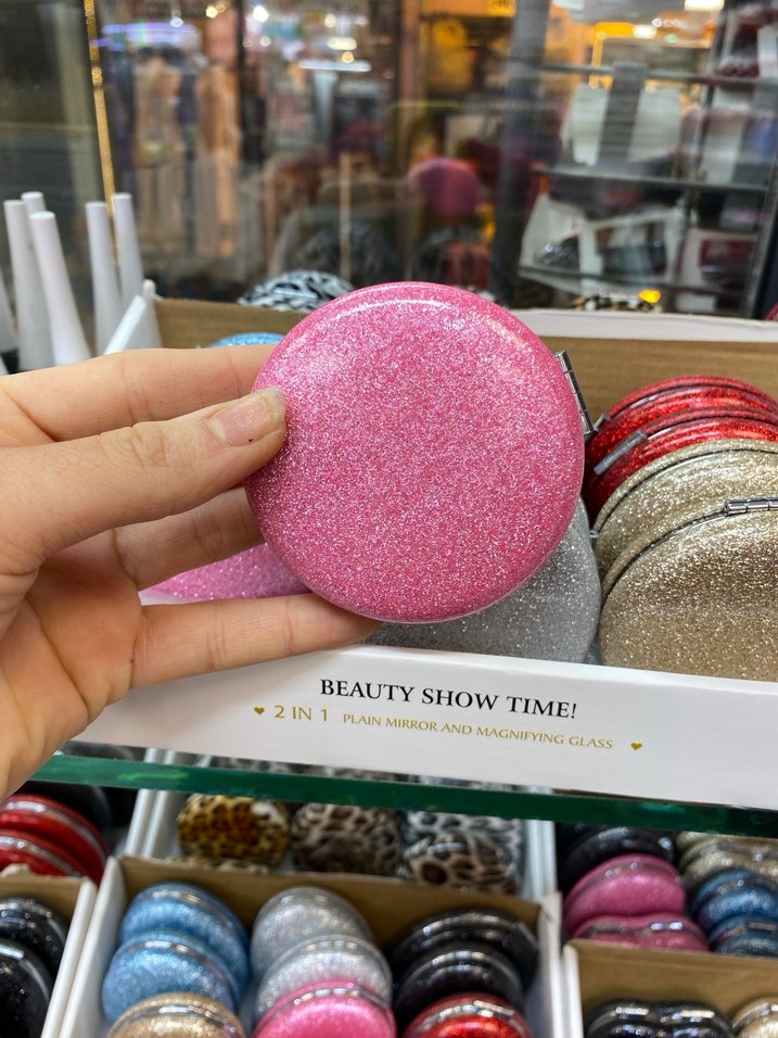 Pembe renkli, parlak dokulu makyaj aynası. Düz ayna ve büyüteç içeren kompakt kutusu ile makyaj tazeleme için uygundur.