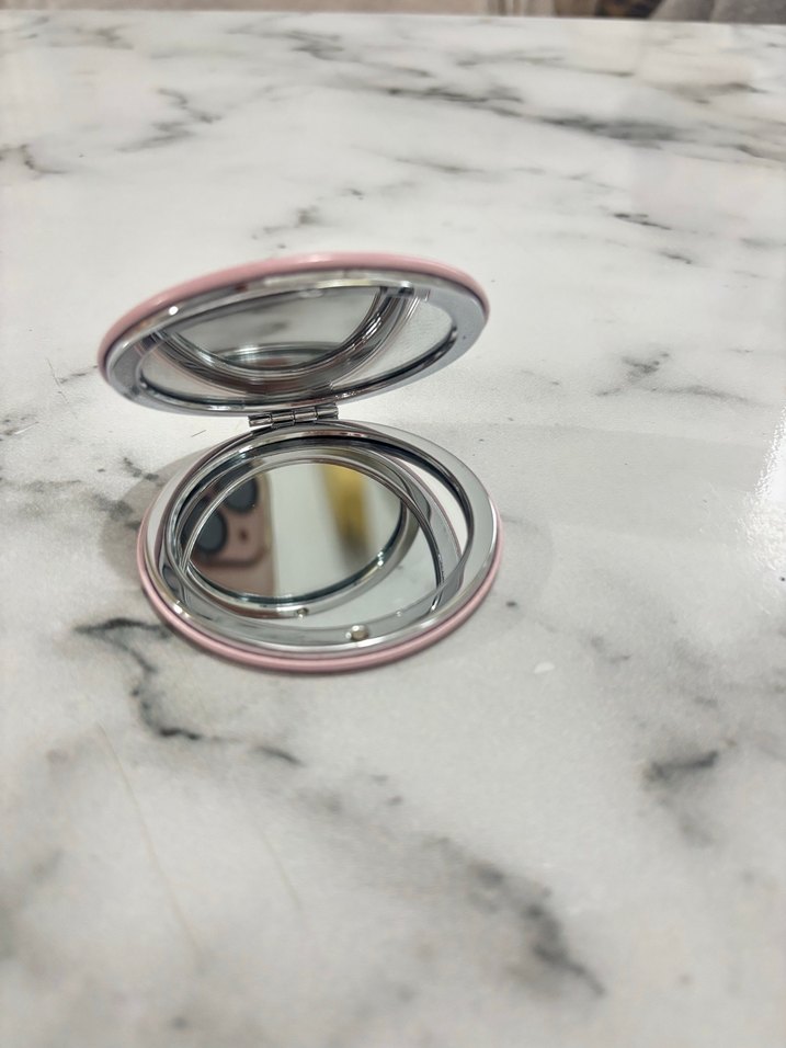 , parlak pembe renkte çift taraflı makyaj aynasıdır. Taşınabilir ve kullanışlıdır