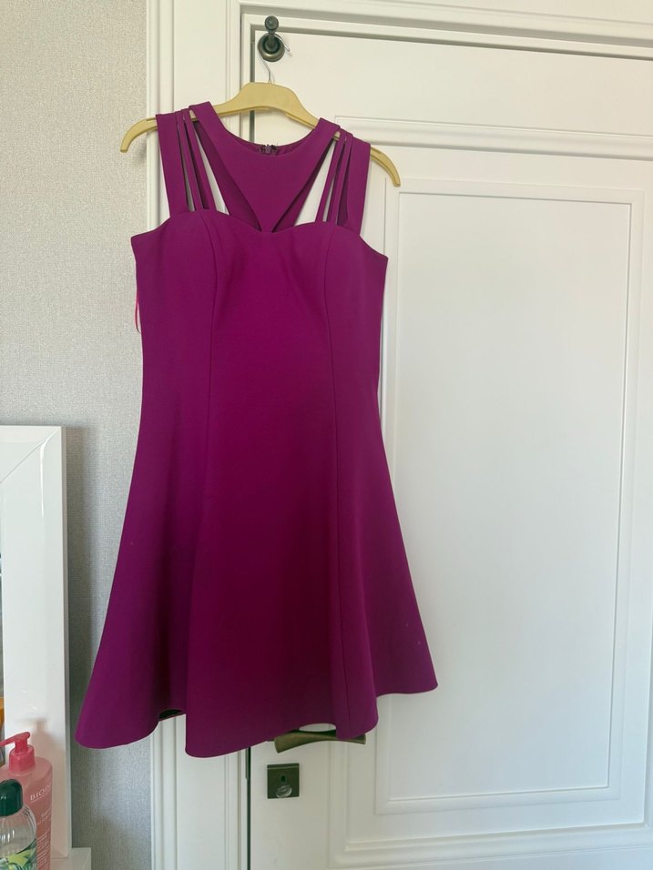 Pembe parlak renkte, askılı ve yaka detaylı, fermuarlı, baskılı, midi boy kadın elbisesi. Romantik akşamlar için uygun.