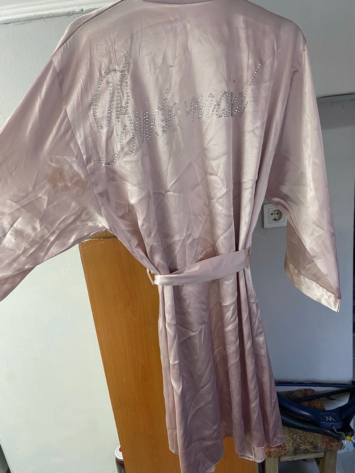 Pembe parlak midi uzunlukta kadın sabahlık, bol kesim ve ince askılı kollara sahip. Bohem Paris tarzını yansıtıyor, kemerli ve desensiz düz kumaş.