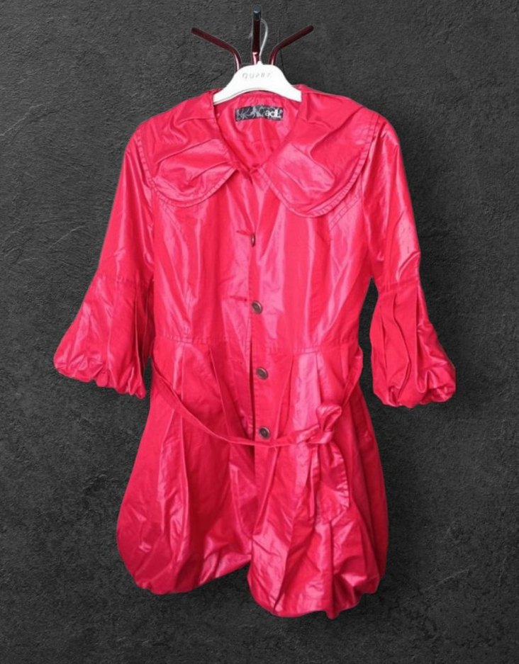 Parlak kirmizi renkte, düğmeli, yakalı ve askılı kollu midi uzunlukta kadın yağmurluğu. Gevşek kesim, Paris sokak modası tarzında, günlük kullanıma uygun.