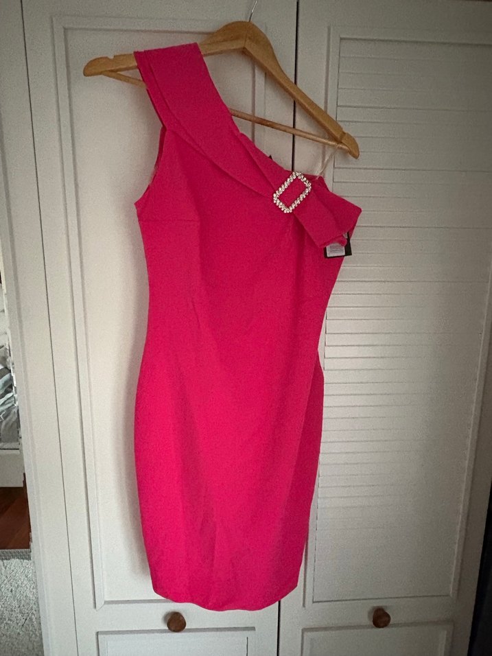 Bu pembe, parlak ve straplez elbise, tek omuzda tokalı detayla dikkat çeker. Midi boyu ve vücuda oturan kesimiyle romantik akşamlar için uygundur.