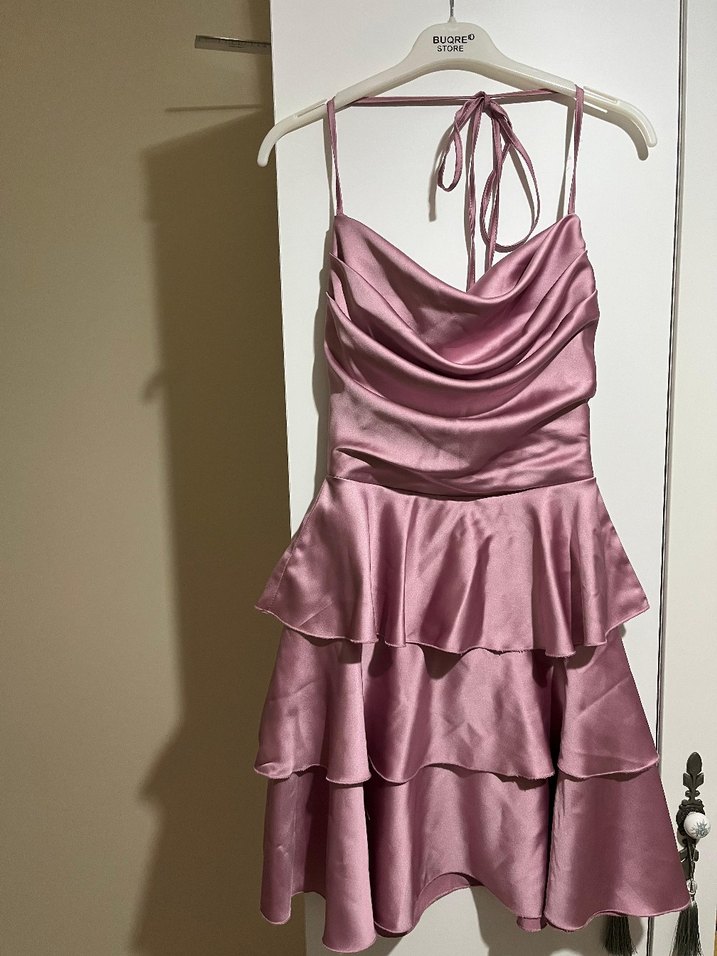 Parlak pembe renkte, mini uzunlukta ve vücuda oturan bu abiye elbise fırfır detaylarına sahiptir. Askılı ve straplez yakalıdır, parti için uygundur.
