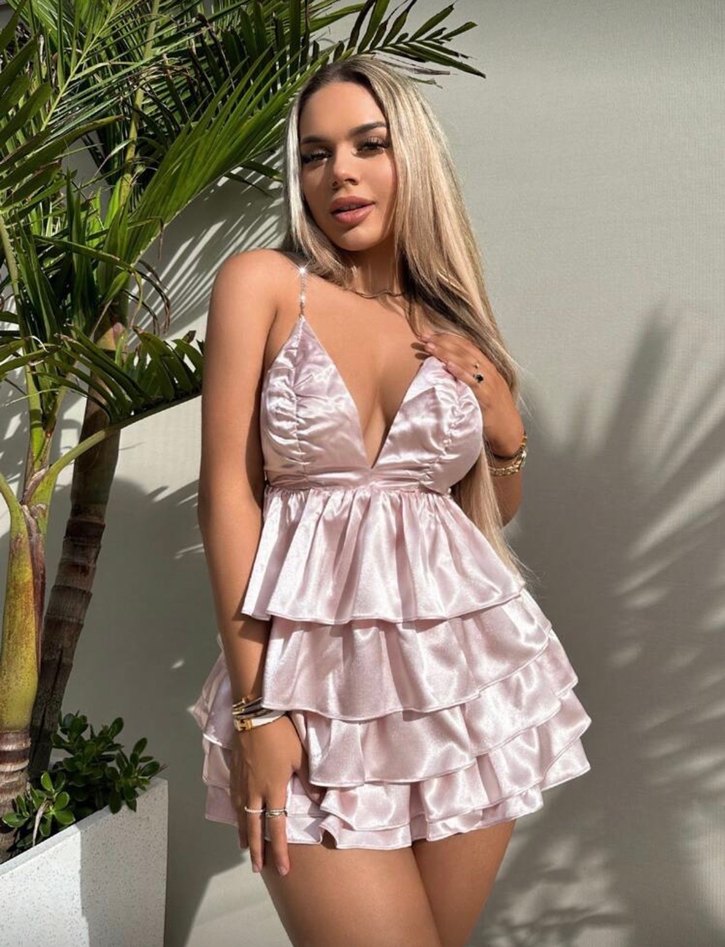 Parlak pembe kumaştan, V yakalı ve askılı, fırfırlı katmanları olan dar kesim mini elbise, parti için uygun.