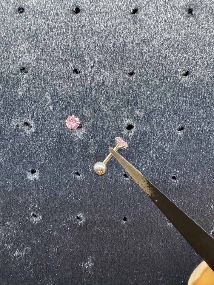 Pembe parlak taşlı, ince ve minimal kesim detaylı kadın piercingi, avangart ve trend stil için uygun. Cerrahi çeliktir.