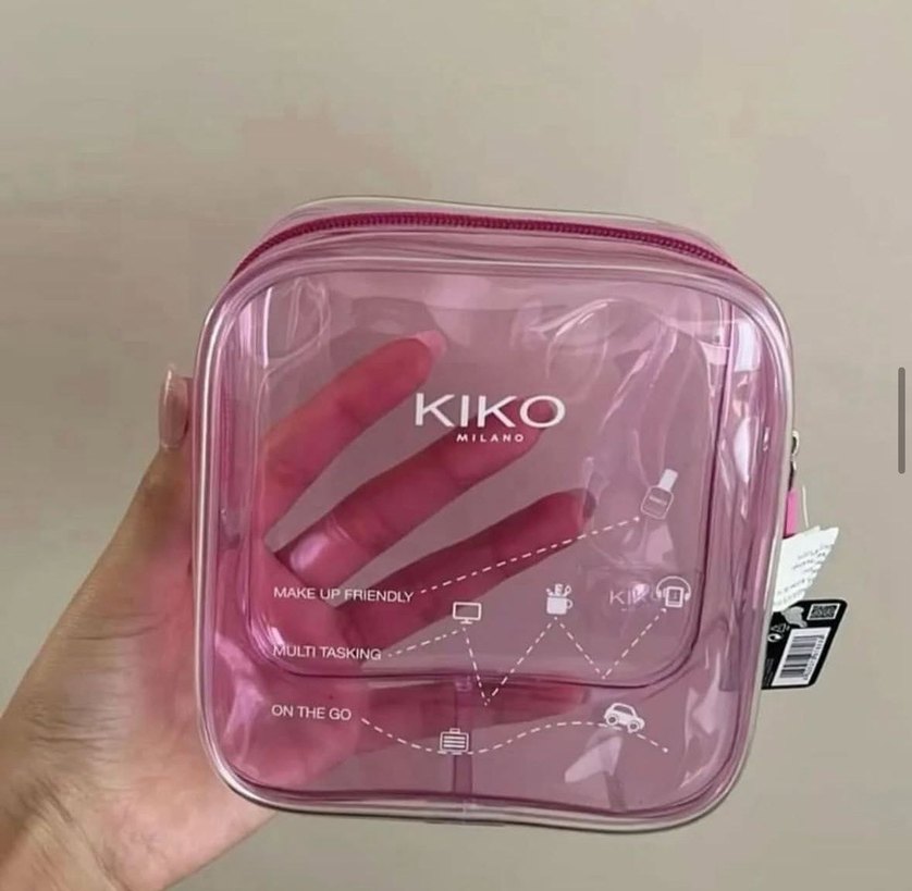 Pembe parlak plastikten yapılmış, minimalist baskılı ve KIKO marka detaylı makyaj çantasıdır. Günlük kullanım için uygundur ve çağdaş bir stile sahiptir.