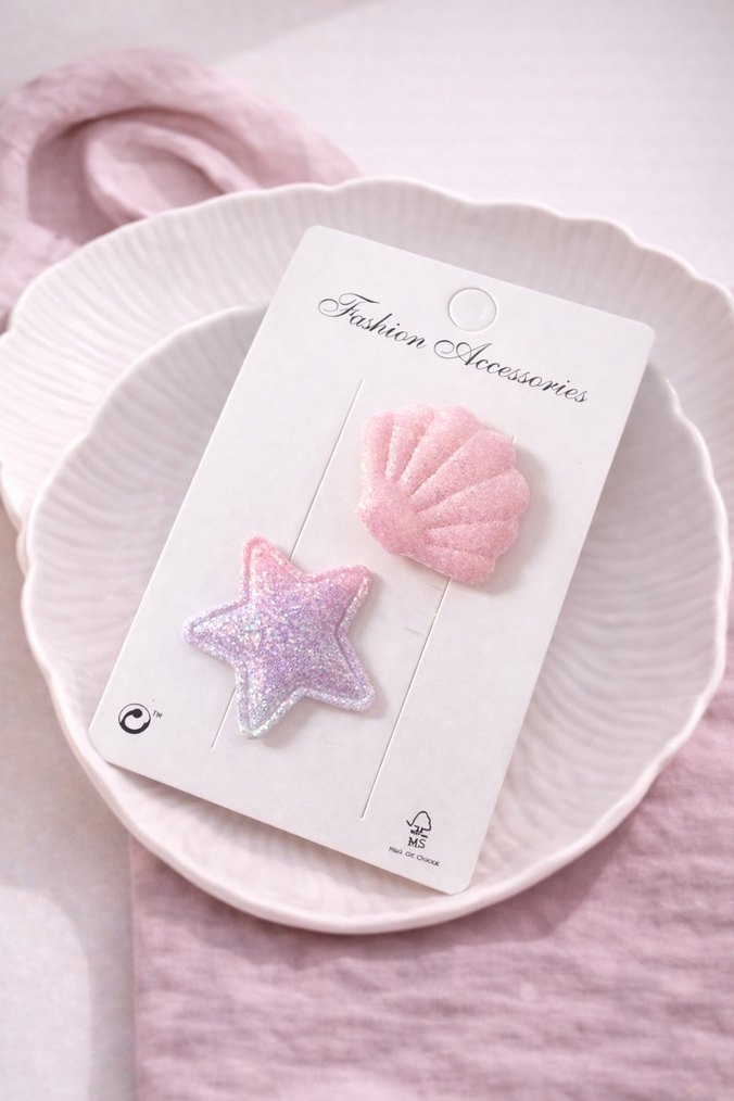 Nakışlı deniz kabuğu ve yıldız figürlü, simli pastel pembe çocuk saç tokaları seti. Sade tarz için uygun. ✨