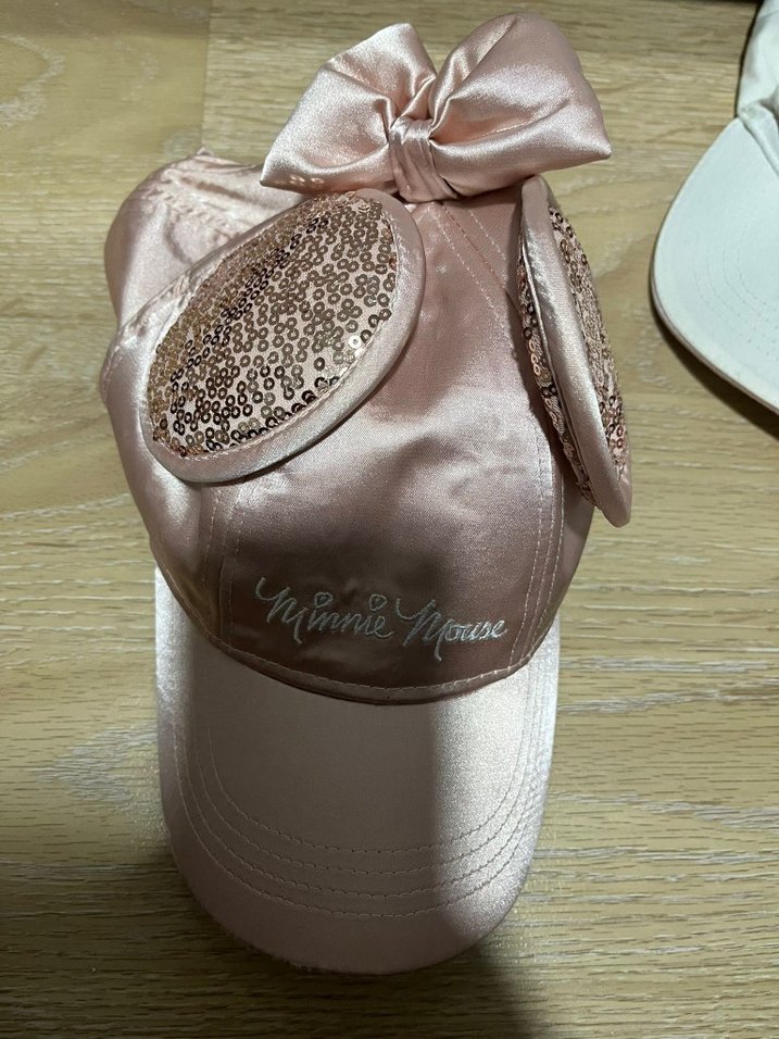 Parlak pembe renkte, payetli Minnie Mouse kulakları ve fiyonk detayları bulunan, saten görünümlü sentetik kumaştan yapılmış sokak stili şapka. 54 Cmdir.