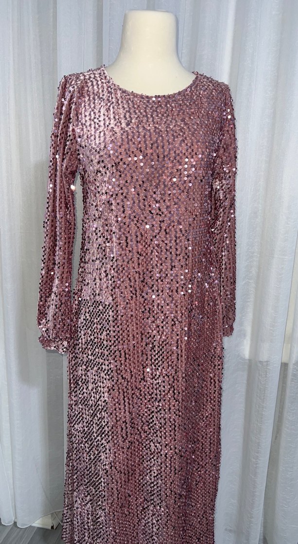 Pembe Parlak Payetli Uzun Kollu Abiye Elbise