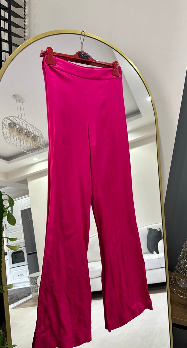 Uzun, pembe, parlak ve piliseli tasarıma sahip bu kadın kumaş pantolonlar, romantik akşamlar için ideal, minimalist ve çağdaş bir tarz sunar.beli bira daraltıldı bol olduğu için ama hiç giyilmedi