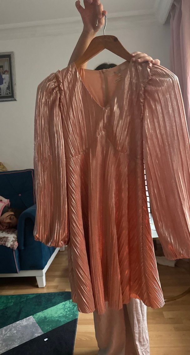 Pembe parlak midi elbise, piliseli detaylara, uzun kollara ve V yakaya sahiptir. Rahat kesimi ve ipeksi dokusuyla romantik akşamlar için ideal, bohem Paris tarzında.