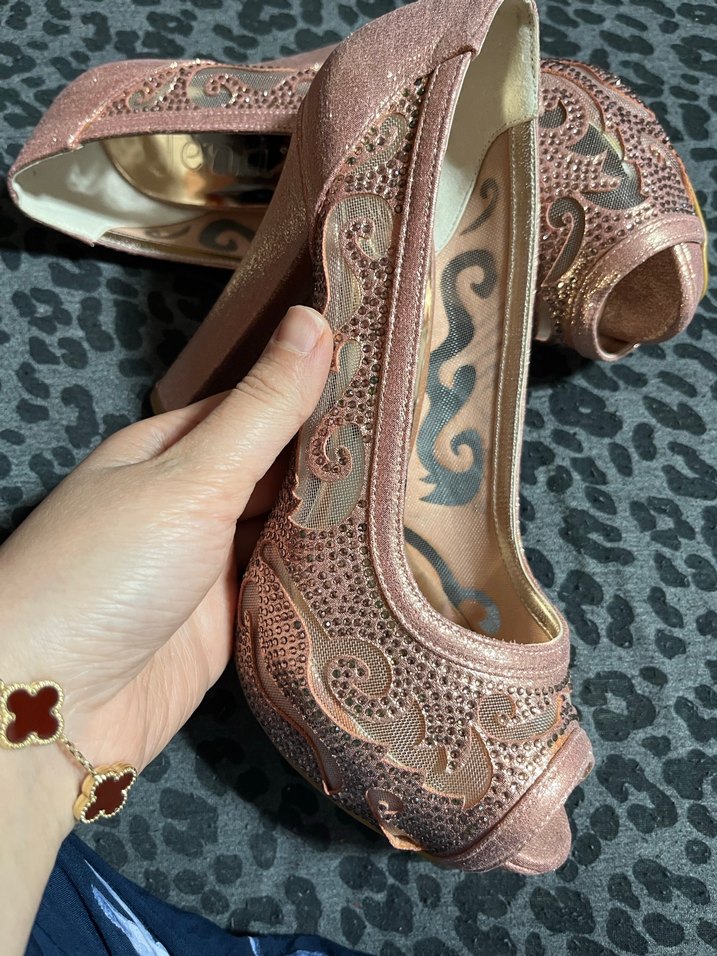 Pembe parlak platform topuklu ayakkabılar, payetli ve desenli detaylara sahip, bohem tarzda düğün için uygundur. Klasik zarafet ve kauçuk taban içerir.