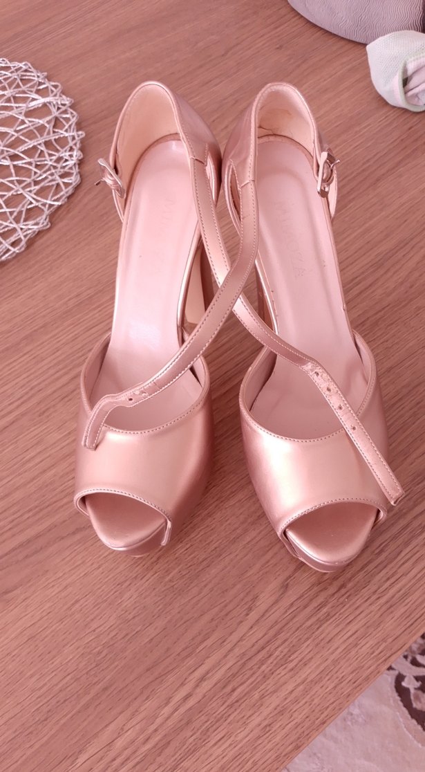 Pembe parlak platform topuklu, tokalı kayışlı, yumuşak kauçuk malzemeden yapılmış kadın abiye ayakkabı. Modern ve şık, düğün için uygun.