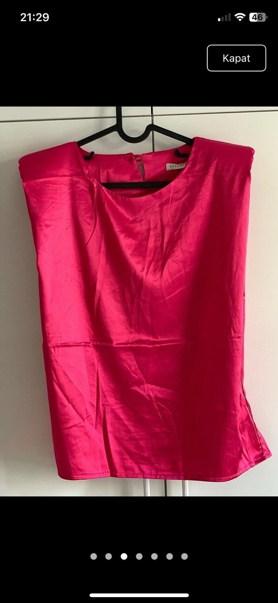 Parlak pembe saten kumaştan, drapeli ve V yakalı kolsuz bluz. Rahat kesimi ve midi boyu ile günlük sokak stiline uygundur.