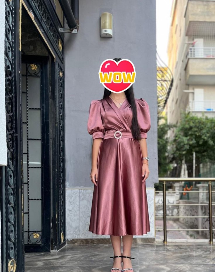 Pembe parlak uzun elbise, V yaka ve bol kesim ile kemerli. İnce askılı kollu ve saten dokulu, düğünler için uygun. 36-38 bedene uygundur. bir kez kullanıldı hiçbir sorunu yoktur.