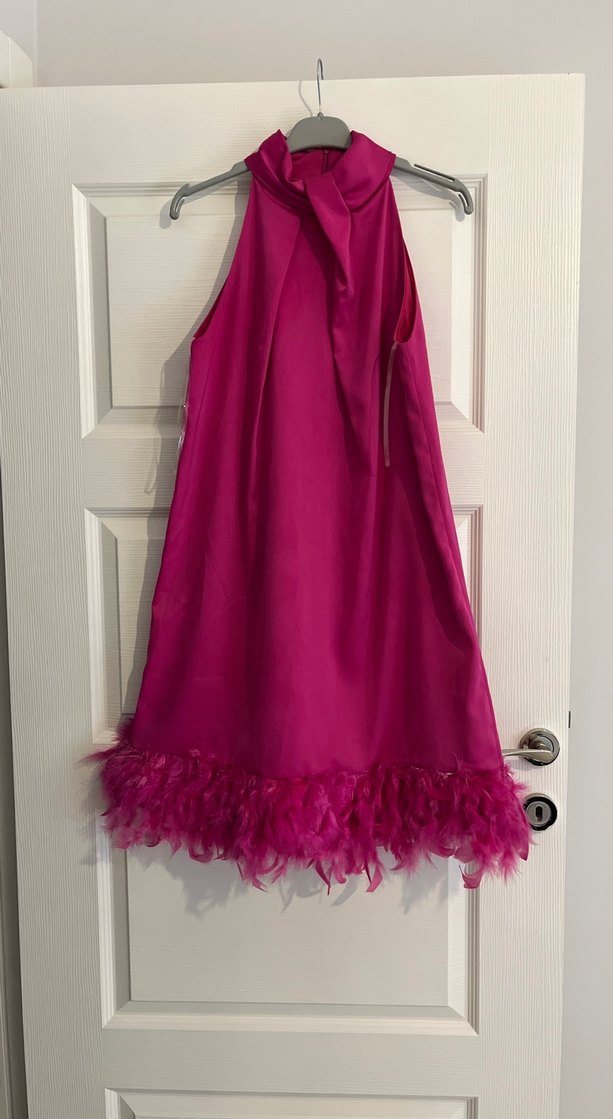Pembe parlak kumaştan, straplez yakalı ve bol kesim kısa abiye elbise. Etek kısmında fırfır detayları bulunur, parti için uygundur. ✨1 defa giyinmiştir. Herhangi bir deformesi yoktur