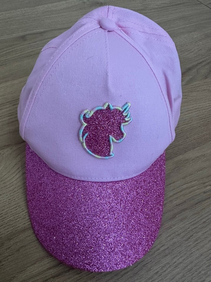 Pembe renkli çocuk şapkası, simli parlak siperliği ve baskılı tek boynuzlu at detayı ile sentetik kumaştan üretilmiştir.