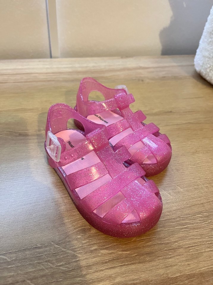 Pembe simli ve parlak kauçuk malzemeden yapılmış kız çocuk sandaletleri, sokak modasına uygun tarzda tasarlanmıştır.