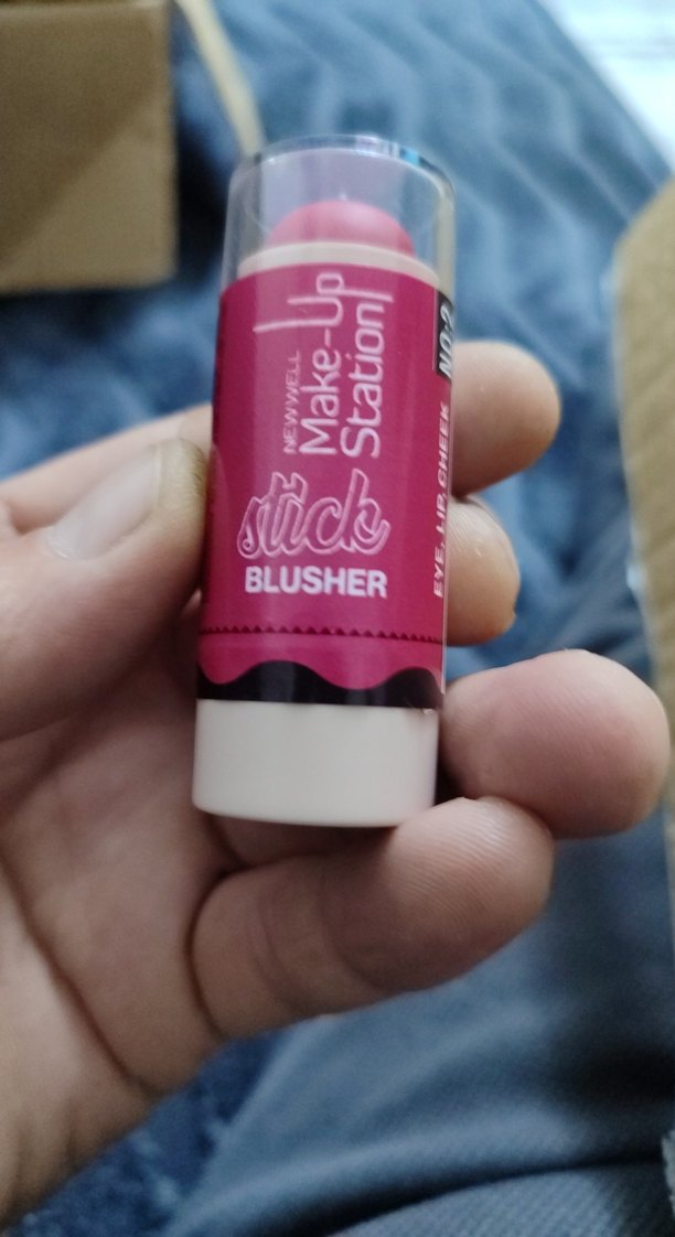 Parlak pembe renkte, 'BLUSHER' etiketi bulunan stick allık. Kompakt tasarımıyla elde rahatça tutulur.