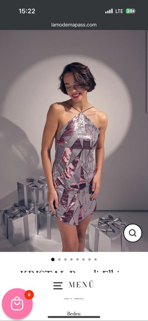 Pembe, parlak, straplez ve askılı detaylı bu kokteyl elbisesi, drapeli ve baskılı desene sahiptir. Parti için uygundur.