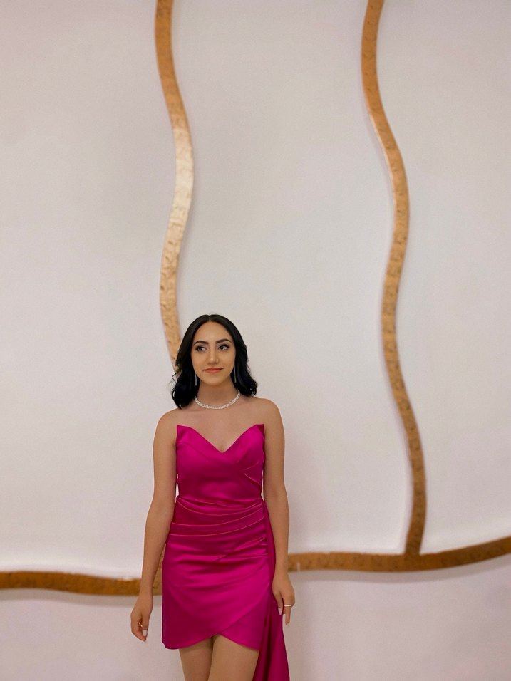 Pembe parlak kumaştan, straplez yaka ve drapeli detaylı, vücuda oturan kısa elbise. 1 kez giyildi.
