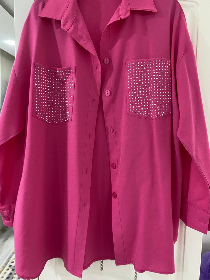 Pembe uzun gömlek, çıtçıtlı ön ve parlak taşlı iki cep ile bol kesim, sentetik kumaştan, günlük sokak stili için uygun.