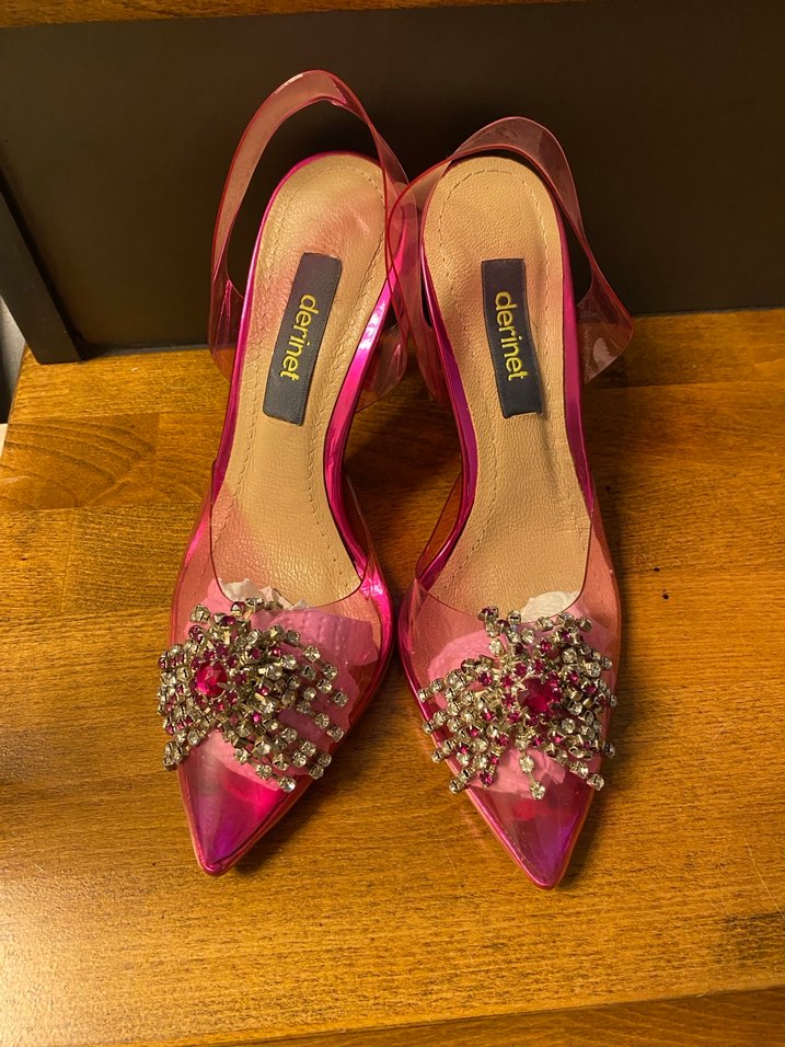 Şeffaf Pembe parlak yüzeyli, tokalı ve desenli yüksek topuklu kadın ayakkabıları, düğün gibi özel anlar için bohem ve gösterişli tarzda tasarlanmıştır.