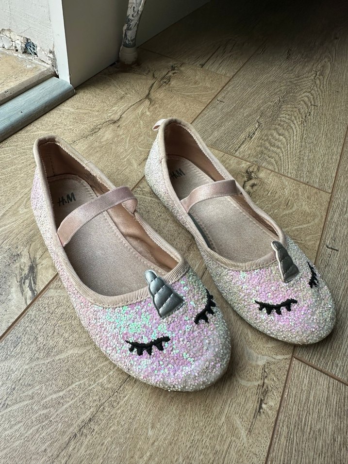Pembe parlak ve unicorn detaylı, kauçuk tabanlı kız çocuk babetleri, trend sokak stili için uygundur.