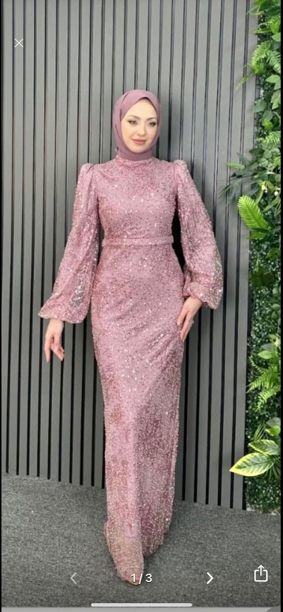 Yüksek yakalı, uzun kollu ve drapeli pembe parlak yılan desenli uzun abiye elbise, düğünler için uygundur. ✨ 3 4 saat giyildi sıfırdan farksız