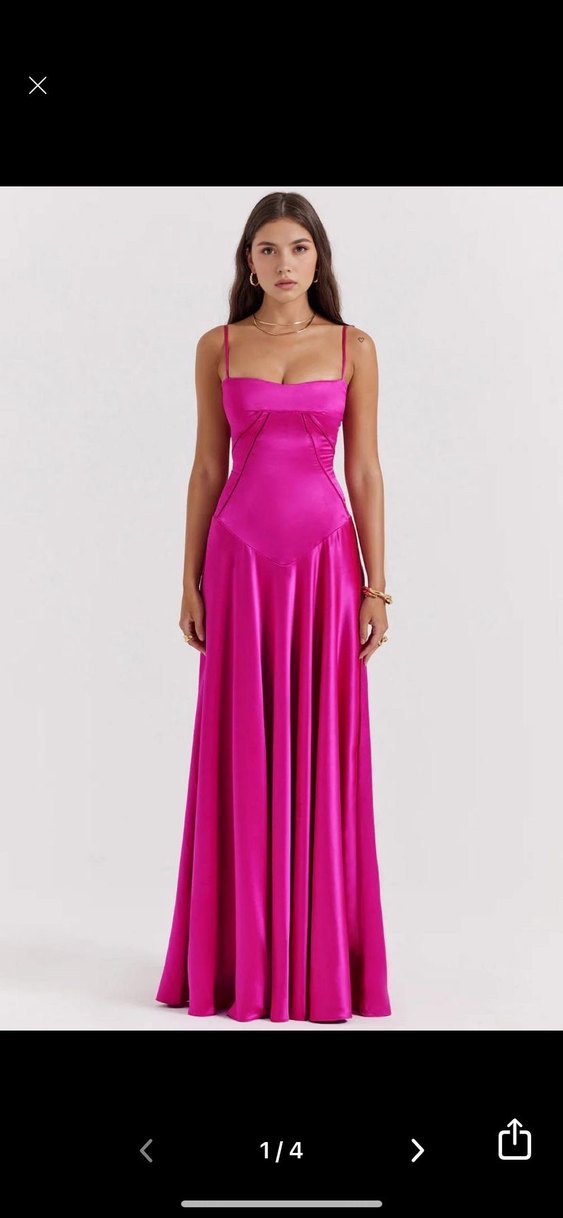 Bu uzun, parlak pembe elbise, saten dokusu ve drapeli tasarımıyla öne çıkar. V yaka ve ince askılı, modern klasik tarzda, romantik akşamlar için uygundur.