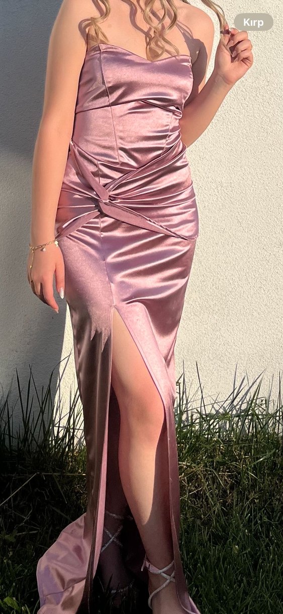Pembe parlak uzun gece elbisesi, drapeli tasarımı ve askısız yakası ile strappy detaylara sahiptir. İnce kesimi ve ön yırtmaçlı, düğünler için uygun.