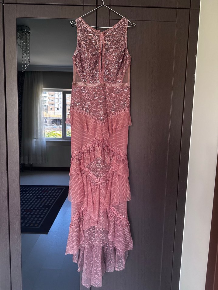 Pembe Parlak Uzun Fırfırlı Abiye Elbise