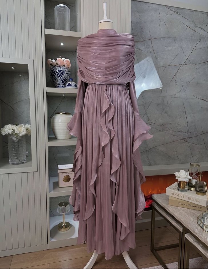 Pembe Parlak Uzun Kollu Kadın Abiye Elbise