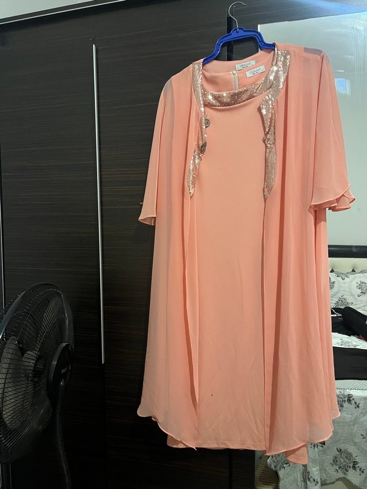 Pembe renkte, uzun ve salaş kesimli, parlak drapeli yüksek yakalı kolsuz abiye elbisedir. Düğünler için klasik zarafet sunar. ✨