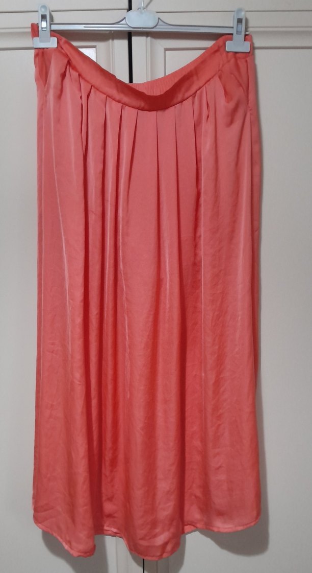 Pembe parlak, ipeksi kumaştan uzun ve salaş kesim kadın eteği, drapeli tasarımıyla minimalist ve şık bir görünüm sunar.